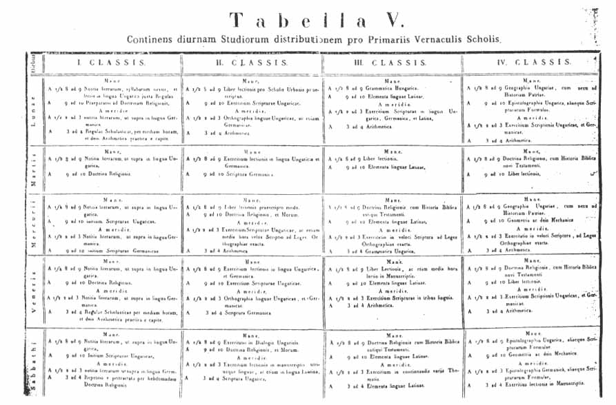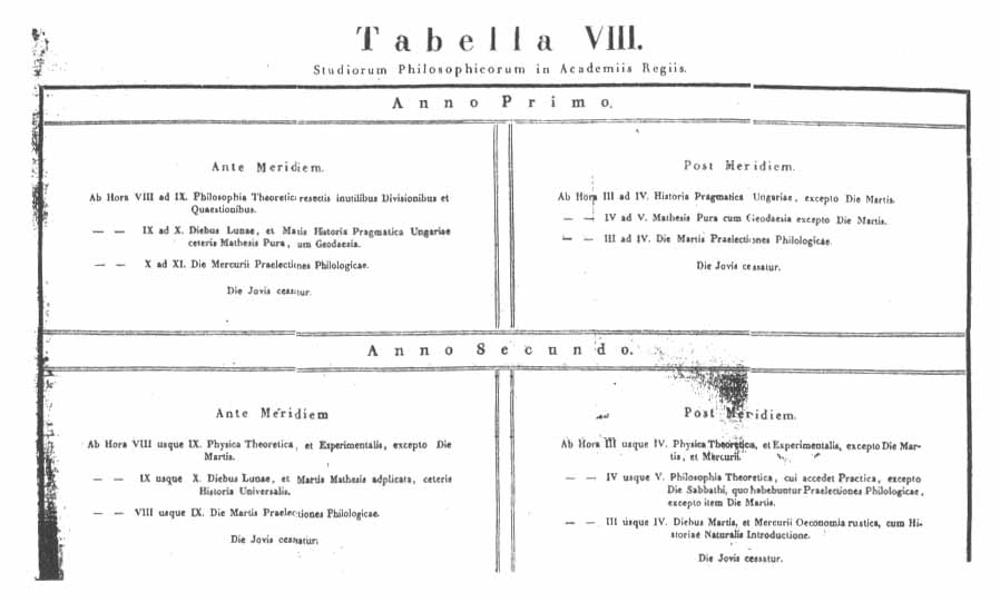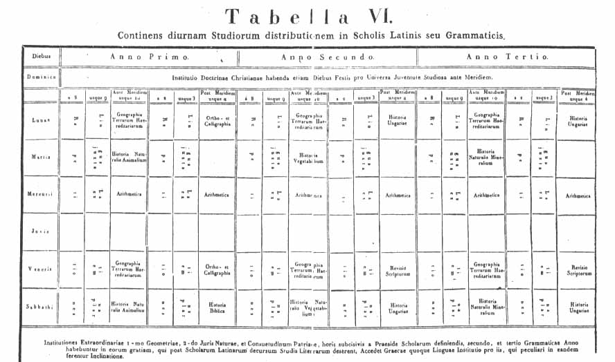 1. ábra. A Ratio Educationis nemcsak általános irányelveket rögzített le, hanem igen sok kérdésben részletekbe menő utasításokat is adott. Itt például egy általános iskola és egy középiskola tanulmányi rendjét találjuk, napra és órára lebontva, vagyis az iskolatípus heti órarendjét. A harmadik táblázat egy kétéves főiskola tanulmányi anyagát évenkénti, azon belül délelőtti-délutáni bontásban mutatja