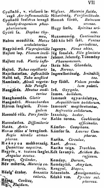 Varga Márton pontosan tudja, hogy mekkora nehézséget jelent az új szavak megértése, elfogadása. Könyve ennek megkönnyítésére egy magyar-latin szótárral indul. Ennek látjuk itt egyik fakszimile oldalát. Két szóra hívnám fel itt a figyelmet: Habos mozdulás = hullámmozgás, Heányos mekkoraság = negatív mennyiség.
