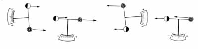 Elvi elrendezés Dicke mérési módszerének magyarázatához. A (különlegesen szerkesztett) torziós ingát (képzeletben) az Északi-sarkon függesztjük fel, ahol az inercia-erõnek a Föld forgásából adódó része kiesik, csak a Nap vonzásából adódó gyorsulás-különbség érvényesül. A Föld forgása a kétféle anyagú test helyzetének felcserélését végzi el – helyettünk. A Napot jobb felé a távolban kell elképzelnünk. A felsô két ábra a 12 óránként egymást követô helyzeteket mutatja.