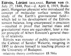 Eötvös munkásságának nemzetközi elismertségét többek között az is jelzi, hogy a világ vezetô nagy, nem szakmai enciklopédiái is foglalkoznak tudományos eredményeivel.