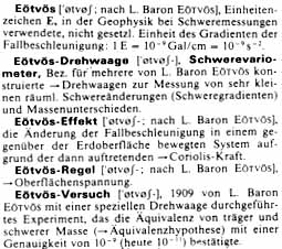 Eötvös Loránd (1. ábra) a legnagyobb magyar fizikus: ez a hazai tudós világ eléggé egyöntetû és jól megalapozott véleménye. Ugyanakkor nem provinciális nagyság, nemzetközi ismertségérõl és érdemeirõl számtalan kitüntetés, díj, méltatás, idézet tanúskodik. Ezek egy része szerepel az életrajzi leírásban. A 2. ábrán látható fakszimile szövegekkel azt szeretnénk bizonyítani, hogy még az általános, tehát nem szakenciklopédiákban is találkozunk nevével és eredményeivel. A 30 kötetes egészen modern Brockhaus enciklopédia öt címszava kezdõdik – az életrajzi cikken kívül – az Eötvös névvel: Eötvös-egység, Eötvös-inga, Eötvös-effektus, Eötvös-szabály, Eötvös-kísérlet. A 30 kötetes Nagy szovjet enciklopédiában az Eötvös-egyenletet (ez a német felsorolásban Eötvös-szabályként szerepel) és egy részletes ismertetést találunk az Eötvös-ingáról variometrgravitacionnüj címszó alatt, az életrajzi cikken kívül. A világ legismertebb enciklopédiája, az Encyclopaedia Britannica már fukarabb az elismeréssel. Egyetlen rövid életrajzi címszót szentel Eötvösnek. Amerikában lényegében Eötvös csak annyiban érdekes, amennyiben nevét össze lehet kapcsolni Einsteinével: a tehetetlen tömeg és a gravitációs tömeg azonosságát a legnagyobb pontossággal bebizonyítva az általános relativitáselmélet megalapozásához nyújt az empíria oldaláról hathatós támogatást.