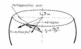 A testek tehetetlen és gravitáló tömegének azonosságát kimutató kísérletben szereplô gravitációs és inerciaerõk nagysága és iránya. Fg alatt azt a Föld középpontja felé mutató erôt értjük, amellyel a (középpontba képzelt) M földtömeg az mg gravitáló tömegû testet vonzza, vagyis Fg = G·mg M/R2.