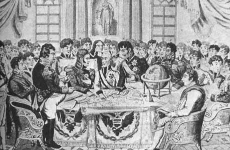Õk láthatók a kép közepén. (Érdemes még megemlíteni: Wellington herceg baloldalt, Talleyrand francia külügyminiszter jobboldalt, kissé háttérben Metternich herceg.) A három uralkodó a második párizsi békeszerzõdés elõtt (1815. szeptember 26.) ünnepélyesen megfogadta, hogy egymást kölcsönösen testvérüknek tekintik, államaik mind belsõ, mind külügyeiben csak a keresztény vallás parancsait, az igazságosságot, a szeretetet és a békességet fogják szem elõtt tartani.