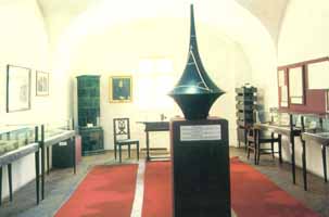 A marosvásárhelyi Bolyai Múzeum kisterme. Középen áll a fából esztergályozott, feketére festett pszeudoszféra-modell, a rárajzolt "egyenes vonalak" által kijelölt háromszöggel. Az egyeneseknek a geodetikus vonalak felelnek meg, vagyis olyan felületi görbék, amelyek fônormálisa minden pontban egybeesik a felületi normálissal (a távolság az ilyen görbe két pontja között a vonalon mérve kellôen leszûkített környezetben minimális értékû). Az ábrázolással kapcsolatos problémákról, az irodalomban található ábrák általánosan hibás voltáról Oláh-Gál Róbert cikkeiben találhatunk érdekes kritikai megjegyzéseket. Ô számítógép segítségével rajzolt a pszeudoszférára a fenti definíciónak megfelelô "egyeneseket".