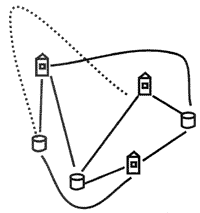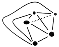 De miért érdekes, hogy a fenti keresztezõdés nélküli összekötések nem lehetségesek? Hogy erre a kérdésre válaszolhassunk, nevezzünk gráfnak egy tetszõleges olyan alakzatot, amely pontokból, és bizonyos pontok között menõ élekbõl áll. A pontokat a gráf csúcsainak nevezzük, és hogy az élek hogyan kötik össze a két végpontjukat, az nem lényeges, csak az, hogy mely csúcsok között mennek élek. Például a három ház – három kút gráfban hat csúcs van, H1, H2, H3 és K1, K2, K3, és a H1, H2, H3 mindegyikét él köti össze K1, K2, K3 mindegyikével, azaz ebben a gráfban 9 él van. A fent említett öt város és a közöttük menõ utak egy olyan gráfot alkotnak, amelynek öt csúcsa van, és bármely két csúcs között megy él. Ezt a gráfot teljes ötszögnek nevezzük.
