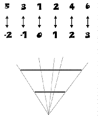 Az 1. probléma: a kontinuum-hipotézis. Hogy a problémát megfogalmazhassuk, vegyük észre, hogy bizonyos, látszólag eltérõ nagyságú halmazok elemei között is létesíthetõ kölcsönösen egyértelmû megfeleltetés. Például a 11. ábra mutatja, hogy az egész számokból (pozitív, negatív vagy 0) és a pozitív egész számokból álló halmazok elemei között van ilyen megfeleltetés, és ugyanez az ábra ad egy ilyen megfeleltetést egy szakasz és egy kétszer olyan hosszú szakasz pontjai között.