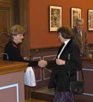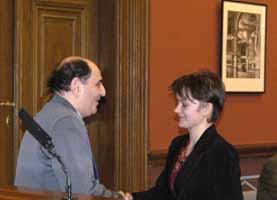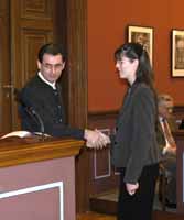 Szabados László gratulál Riger Ágotának Dürr János egykori kollégánk, a Tudományos Újságírók Klubjának főtitkára, a Magyar Szabadalmi Hivatal munkatársa beszédében azt hangsúlyozta, a társadalom számára a legjobb befektetés a kultúra és a tudomány művelése, ápolása, terjesztése, hogy talán világunkban nehezebb dolog egy azonnali hasznot nem hozó kulturális értéket fenntartani, mint régebben. De hiszem – mondja –, hogy sikerülni fog, mert az nem lehet, hogy csak az azonnali forintokban mérhető profittal lehessen csak az országot előrevinni. Úgy gondolom, amikor a mai, szerzővé avatott díjazottak húsz-harminc évesek lesznek, akkor is büszkén gondolhatnak majd vissza erre a március 4-i napra, és bízom abban, hogy közülük sokan még akkor is a szerzőink lesznek. A Metropolis Alapítvány ösztöndíját, amellyel a bírálóbizottság a legeredményesebb felkészítő tanárok munkáját jutalmazta, az idén tizennégy tanár vehette át Kozma Lászlónétól, a Magyar Hivatalos Közlönykiadó gazdasági igazgatóhelyettesétől.