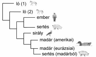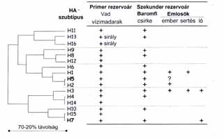 2. ábra. A gazdaspecifikus influenzavírus genetikai vonalai A tartós gazdakapcsolat egy idő után meglátszik a víruson, mert gazdaspecifikus genetikai vonalak alakulnak ki (2. ábra). A hosszú távon is sikeres gazdaváltás azonban nem mindennapos esemény: a szabadon élő vízimadarak influenzavírusainak 16-féle HA-ja közül a csirkében kb. 10, míg az emlősökben csak néhány "vetette meg a lábát" (1. ábra). A madárinfluenza-vírusok természetes elkülönülései és ősisége Bár a HA- és NA-szubtípusok ellenanyagpróbával kimutatható természetes elkülönülések, semmit sem árulnak el a 16-féle HA leszármazási, azaz rokonsági viszonyairól, génjeik evolúciós távolságáról, vagy hogy milyen sorrendben jöttek létre. Az antigénváltozatosság mögött rejlő információk megismeréséhez arra van szükség, hogy egy természetes rendezőelv, a leszármazás alapján csoportosítsunk. A HA-gének szekvenciáinak filogenetikai elemzése tárta fel, hogy a mai változatosság a múltban létezett közös ősökből vezethető le: ezekből fejlődtek szét a mai pozícióikba. Ennek megfelelően egyes szubtípusok jobban összetartoznak, mint mások (1. ábra). Ha a mai események okaira vonatkozóan kívánunk következtetéseket levonni, akkor az ősi rezervoárok vírusaiból (vagy ami ebből megmaradt) kell kiindulni. Kérdés azonban, hogy az ősi rezervoárban ma is előforduló vírusok valóban a régmúlt viszonyait tükrözik-e? Mi az, ami ezek ősisége mellett szól? A HA-k elkülönülése az influenzavírus legősibb diverzifikációs eseménye Az 1. ábrán a természetben kialakult szétválásnak megfelelően ábrázolom a HA-altípusokat. A HA-diverzitás ősisége mellett elsősorban az szól, hogy egyetlen más gén sem mutat ilyen nagy mértékű variabilitást sem számban, sem egymástól való genetikai, azaz evolúciós távolságban. A 16-féle szubtípus aminosavra számított variációja nem kevesebb mint 20-70 százalék között mozog (mondjuk ember-egér-távolságra vannak a legtávolabbiak!), ami rendkívüli, mert közben immunszelekció is alig érvényesül, ugyanis a vízimadarakban ezek a vírusok lényegében "evolúciós takaréklángon" léteznek. Egy másik érv az ősiség mellett a biogeográfiai elvből (az orosz Vavilovról elnevezett szabályból) vezethető le, mely szerint valamely faj legnagyobb diverzitása az eredet helyén található. A mi rendszerünkben, vagyis a HA-t (de az NA változatosságát is) tekintve, ez a primer gazdák, azaz a vad vízimadarak életterének felel meg. Az 1. ábrán látható filogenetikai csoportok azt is világossá teszik, hogy a felfedezésük után kapott sorszámok nem tükröznek valamiféle hierarchiát. Az emlősöket is kolonizáló szubtípusok, köztük az emberéi is, véletlenszerűek, semmiféle kitüntetett pozíciót sem jelentenek a többivel szemben. A madárinfluenza-vírusok geográfiai elkülönülése Ez a másik ősi elkülönülés abban nyilvánul meg, hogy a madarak influenzavírusainak létrejöttek földrajzi - amerikai és eurázsiai, sőt némelyiknek ausztráliai - változatai is. A folyamat úgy képzelhető el, hogy az ősi víruspopulációkból (akárhol is alakultak ki eredetileg) valamikor vírusok kerültek át a másikféltekére, majd itt is ott is tovább távolodtak egymástól. Mivel a legtöbb HA-nak megvan mindkét változata, ez arra utal, hogy a földrajzi elkülönülés később következett be, mint a szubtípusokra történt szétválás. Ezért a vírus eredetének megjelölése is fontos, ha ugyanaz a szubtípus egyszerre több helyen is előfordul. [Például a kilencvenes évek eleje óta a H5 amerikai változatát Mexikóban, eurázsiai változatát pedig Kínában felbukkant MIV-törzsekben lehetett kimutatni. A köztük levő genetikai különbség jelentős, így a két járvány között epidemiológiai (közvetlen átviteli) kapcsolat nincs.] Előfordulhat, hogy egy adott helyen vagy fajban olyan régóta tart a diverzifikálódás, hogy az antigénhasonlóság lassan megszűnik, és a szubtípus kettéválik, ahogy ezt a sirályvírusoknál figyelték meg (lásd az alábbiakban). A madarak rendjében eléggé különböző taxonómiai csoportokba tartozó gazdák vesznek részt a vírus fenntartásában, ezért az a kérdés merül fel, hogy ezek egyformán hatékony, jó gazdái-e valamennyi MIV-változatnak, azaz adott vírus számára szabad-e az átjárás közöttük, vagy pedig a vírusok inkább szűkebb gazdaspektrummal rendelkeznek. Gazdaspecifikus vírusvonalak kialakulása a primer rezervoárban A kérdés fontossága nyilvánvaló. Ha ezek létrejöttének mechanizmusát megértjük, könnyebb predikciót tenni más vírusok gazdafoglalására vonatkozóan is (pl. a madár-H5N1 lehetséges megtelepedésére emberben). Van néhány, a természetes rezervoárban működő tényező, amely képes féken tartani a vírusok térhódítását, akár a földrajzi elterjedést, akár egy új gazda elfoglalását nézzük. Ilyenek a zömmel észak-déli tengely mentén zajló madárvonulások vagy az élőhelyek viszonylagos földrajzi elszigeteltsége. Ezekkel a passzív tényezőkkel áll szemben a vírus azon változási képessége (ténylegesen adaptálódás), amely révén olykor átlépheti a faji határokat. Ennek molekuláris mechanizmusa a következőkben foglalható össze. A különböző fajú sejtek felszínén eltérő szerkezetű fogadó struktúrák, receptorok léteznek, amelyeken a vírus megtapadhat. Sikeres kötődés (majd fertőzés) csak akkor jöhet létre, ha a vírus HA-nyúlványának disztális végén található receptorkötő helyet adó tucatnyi aminosav, amelyek egyébként nem alkotnak folytonos szekvenciát, olyan együttállásban fordul elő, amely tökéletes illeszkedést tesz lehetővé a receptorhoz. Adott fajú sejt megfertőzésének sikere tehát közvetlen