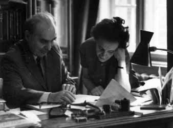 3. ábra. Az idős Detre házaspár munka közben 1951-ben az obszervatórium a Magyar Tudományos Akadémia fennhatósága alá került, s ezzel olyan fejlesztések válhattak valóra, amelyekről korábban csak álmodni lehetett. Ekkor Detre már a csillagda (akkori nevén az MTA Csillagvizsgáló Intézete) igazgatója volt: 1943-tól haláláig (1974. október 15.) irányította a hazai csillagászati kutatások első számú műhelyét. A leglátványosabb előrelépés, a Piszkés-tetői Obszervatórium létrehozása és fejlesztése két évtizeden át tartó folyamatos erőfeszítéseket kívánt Detrétől. Az ott jelenleg is működő mindhárom távcső az ő idejében létesült. A legelső, a 90 cm átmérőjű főtükörrel szerelt, 60 cm szabad nyílású Schmidt-teleszkóp 1962 óta van használatban, egy kisebb, 50 cm átmérőjű Cassegrain-távcső 1966-tól működik, míg a harmadikkal, az ország legnagyobb távcsövével (4. ábra), amelynek főtükre 1 m átmérőjű, éppen Detre halálának évében kezdhettek dolgozni a csillagászok. Míg a két utóbbi távcső elsősorban a változócsillag-kutatásokhoz szükséges észlelésekre alkalmas műszer, a Schmidt-távcső nagy látómezejével és fényerejével a stellárstatisztika mint új kutatási program megindítását tette lehetővé az intézetben. Emlékezetes, hogy Detre éppen e témából készítette 1929-ben egyetemi doktori értekezését.