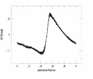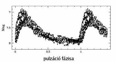 6. ábra. Az RR Geminorum egészen csekély fénygörbe-modulációját csak nemrég sikerült kimutatni A déli félteke számos csillagászati obszervatóriumában pedig az 1990-es évek óta intenzíven követik a Tejútrendszer két szomszédjában, a Magellán-felhőkben felfedezett nagyszámú RR Lyrae csillag fényességváltozásait. Mostanra minden várakozást meghaladó mennyiségű és minőségű észlelési adat gyűlt össze mind a stabil fénygörbéjű, mind a modulált RR Lyrae csillagokról. A megfigyelt törvényszerűségek és a számítógépes csillagmodellek segítségével remélhetőleg néhány éven belül végre kiderül, hogy miért viselkednek így ezek az érdekes változócsillagok. Az ehhez vezető úton pedig Detre László múlhatatlan érdemeket szerzett. Köszönettel