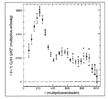 1. ábra. A Kozmikus Mikrohullámú Háttérsugárzás intenzitásbeli ingadozásainak multipólusokra felbontott erõssége (Cl ). A multipólus rendje (l) fordítottan arányos a szögfelbontással. Az ábrán világosan kivehetõ két (esetleg három) maximum helye. A részletes elemzés szerint az elsõ maximum helyét annak a tartománynak a mai látószöge határozza meg, amelyikbõl a sugárzás eredt. A maximum magasságából viszont az univerzum teljes energiasûrûsége olvasható ki. A második maximum helyébõl és magasságából a protonszerû anyag részaránya állapítható meg.
