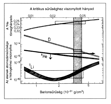 Jóval a KMHS keletkezése elõtt a protonok és neutronok alkotta forró homogén gázban zajlottak azok a magreakciók, amelyeknek eredményeként létrejöttek ezek az elemek. A reakciókinetika segítségével elõfordulási arányaikat egyetlen paraméter értékének rögzítése esetén meg lehet jósolni, ez pedig éppen az univerzum barionikus anyagsûrûsége (2. ábra).