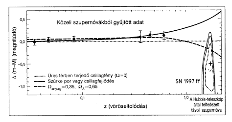 A pöttyökkel jelölt mérési pontokból érkezõ jel tulajdonsága úgy is megfogalmazható, hogy ezek a szupernóvák halványabban világítottak, mint az üres teret jellemzõ tágulás esetére várnánk, azaz ehhez az esethez képest gyorsabban mozogva a becsültnél távolabb emittálták a fényt. Ezt a gyorsítást csak egy antigravitációs hatású energiahordozó jelenléte magyarázhatja. A különbözõ jelöltek közül az Einstein nevéhez fûzõdõ kozmológiai állandó a legismertebb, amelynek legfontosabb tulajdonsága az állandó, az univerzum méretétõl független energiasûrûsége. Ezt a modellt elfogadva, a mérési adatokat egy olyan kritikus összenergia sûrûségû modell tudja reprodukálni, amelyben jelenleg a kozmológiai állandó vagy az annak hatását imitáló anyagtér képviseli a teljes energiasûrûség 60-70 százalékát. Ebbõl következik a szokásos anyag és a hozzá kölcsönhatással csatolódó egzotikusabb (pl. szuperszimmetrikus) anyagfajták 35 százalékot meg nem haladó részesedése.