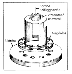 4. ábra. A gravitációs erõhatás newtoni képletét milliméteres távolságon ellenõrzõ Eöt-Wash-kísérlet berendezésének vázlatos képe. A torziós szálra felfüggesztett, elfordulni képes 1,846 mm vastagságú rézlapra az álló, 7,825 mm vastag rézlap gyakorol tömegvonzási hatást. A függõleges távolságot a két lap között változatva a torziós szál elfordulását mérték. A most közzétett méréssorozatban használt készülékben a lapokra 18 fokos elforgatással 10-10 kör alakú, azonos méretû lyukat fúrtak, amelyek hatására a két lap között fellépõ tömegvonzási erõben a milliméteres távolságra lévõ részek közötti vonzás dominál. A mérésekkel a korábbinál egy nagyságrenddel kisebb távolságokra sikerült bizonyítani a korrekciómentes háromdimenziós Newton-törvény érvényességét.