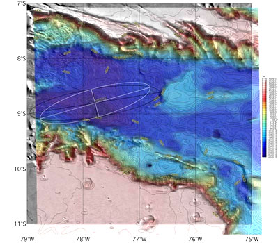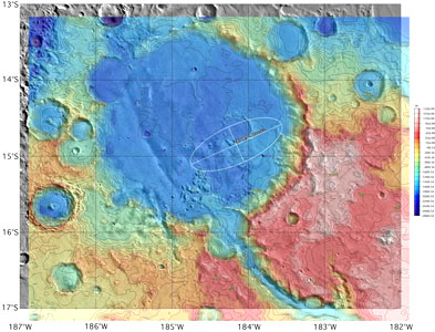 1. kép. Üledékes síkság a Mariner-völgy aljzatán (kékkel a mélyebb, pirossal a magasabb térszínek)