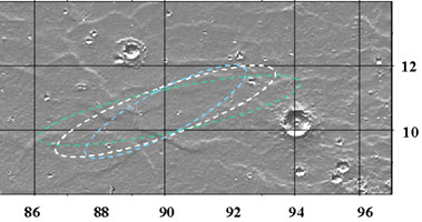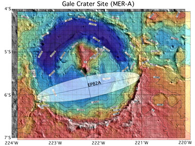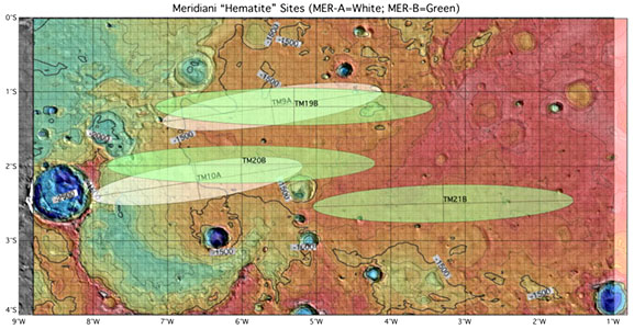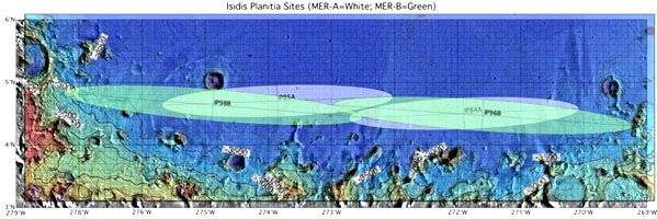 Nyugatról kelet felé haladva a NASA 2004. elején megérkezõ leszállóegységei számára kiválasztott lehetséges helyszínek jellemzõi a következõk (fehér színnel az elsõ, zölddel a második egység landolási ellipszise):