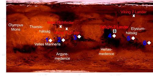 Ha mindezek ismeretében megvizsgáljuk a marsi leszállóhelyeket, már nem is annyira meglepõ erõs hasonlóságuk: közepes méretû szikladarabokkal borított sík területek az alacsony vagy közepes „Mars-rajzi” szélességeken, ahol az év során viszonylag sok napsugárzás jut a felszínre (A térképen X jelzi korábbi leszállóegységek helyét, amelyek ma is ott nyugszanak a felszínen, a célkereszt a Beagle–2 már kijelölt landolási területét mutatja, a Mars Exploration Roverek végsõ célpontjait pedig az 1–6. számú helyszínek közül választják majd ki).