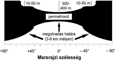 Mai tudásunk szerint külsõ bolygószomszédunk nem volt mindig olyan fagyos és száraz, amilyennek most ismerjük. Fejlõdésének kezdeti idõszakában sokkal jobban hasonlított a Földre, felszínén óceánok és tengerek vize hullámzott, krátereiben tavak gyûltek össze, völgyeit folyók mélyítették. Ám késõbb, számos folyamat eredményeként a hõmérséklet csökkeni kezdett, így a levegõ- és vízburok is átalakult. Illóanyag-tartalmuk (mindenekelõtt a víz) egy része elszökött a bolygóról, másrészt a poláris jégsapkákban gyûlt össze, továbbá nagy mennyiség raktározódott el a felszínt borító kõzettörmelék, a regolit repedésiben is, fagyott állapotban. Így kialakult egy állandóan fagyott réteg, hasonló a például Kanadában vagy Szibériában ismert permafroszthoz, amelynek alsó, illetve felsõ határmélysége egyaránt változik az éghajlatnak (s ezzel összefüggésben a „Mars-rajzi szélesség”-nek) megfelelõen (1. ábra). Ennek ismeretében a Mars kiterjedt régiói periglaciális (jégkörnyéki) területeknek tekinthetõk, amelyek alapvetõ sajátossága a fagyott víz idõszakos, felszín alatti jelenléte.
