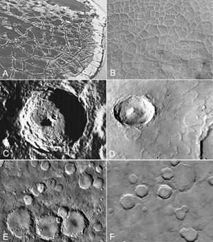 – E és F: éles, illetve kissé elmosódott, domborzati relaxáción átesett kráterek a Marson, amelyek életlen formáit szintén a felszín alatti jéghez kapcsolódó tömegmozgások hozták létre.