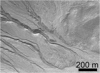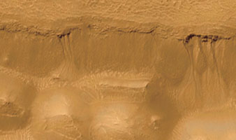 A vízmosások keletkezésének magyarázatát egyrészt globális elhelyezkedésük támasztja alá: fõként a közepes szélességeken ismertek, ahol már jelentõs lehet a regolit pórusainak jégtartalma. Másrészt tovább erõsítik a fentieket azok a felvételek is, amelyeken több hasonló forma látható egy-egy rétegekbõl felépülõ sziklafal mentén, azonos magasságban, vagyis azonos rétegbõl „táplálkozva” (9. kép). Ilyen jellegû sziklafalak a Földön is vannak, például az arktikus szigetvilág területén. Egy friss eredmény szerint a Devon-szigeten megfigyelt formák (6. ábra) kialakulásához azonban nincs szükség felszín alatti víztartó rétegek jelenlétére és felszakadására, hanem elég a forrásrégióban történõ hófelhalmozódás is. A meleg évszakban ebbõl meginduló vízfolyások ugyanis alkalmasak a vízmosások kialakítására – a Földön legalábbis. Figyelembe véve a marsi hõmérsékleti és nyomásviszonyokat, nem biztos, hogy hasonló folyamatok mûködhetnek ott is. Továbbá, a mai éghajlaton nem mindenhol lehetséges hófelhalmozódás azon marsi területek közül, ahol láthatók ilyen jellegû vízmosásnyomok. Vagyis ezen magyarázat esetén is számolni kell a Mars globális változásaival, amelyrõl igen keveset tudunk.