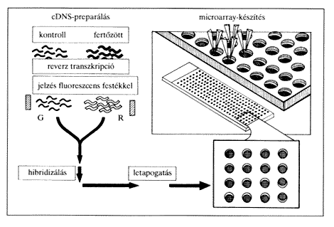 A DNS-csipeken mutációk (például nukleotidcsere) jelenlétét vagy hiányát keressük. Ez a módszer veleszületett génhibák, illetve az úgynevezett „single nucleotide polymorphism” (SNP) vizsgálatára használható. Utóbbiak pontmutációk, amelyek mint független genetikai allélok kezelhetõk, kombinált vizsgálatuk individuális genetikai jellegzetességek követését teszi lehetõvé. Több száz vagy ezer SNP egyidejû leolvasása kitûnõen alkalmazható betegségek azonosítására, de akár gyógyszermellékhatások kimutatására is (lásd késõbb). Génexpressziós microarray esetén a kérdés az, hogy két összehasonlítandó mintában (például egy sejt vagy szövet két aktivációs állapota, egy biológiai hatóanyag hatása a kontrollhoz képest, egy egészséges és egy betegbõl származó szövetminta összehasonlítása stb.) milyen gének fejezõdnek ki, és ezek mennyiségileg hogyan viszonyulnak egymáshoz. Ezt génexpressziós profilnak nevezik. A profilok összehasonlításával felismerhetõk és azonosíthatók az adott hatásra jellemzõ gének. Technikailag ez úgy történik, hogy a kétféle mintából származó mRNS-mintát, illetve azok cDNS-re átírt formáját kétféle festék (például zöld és piros) egyikével jelölik, majd keverve a két populációt, hibridizálják azt a mikrocsippel (1. ábra). Amennyiben az egyik (például zöld festékkel jelzett) mintában az adott csipponton reprezentált gén erõsebben fejezõdik ki, a leolvasás itt „zöldebb” pontot fog detektálni, fordított esetben viszont „pirosabb” lesz. A legtöbb esetben a két szín megfelelõ kombinációja jelzi a két mintában egy adott gén kifejezõdési arányát. Lehetséges az is, hogy a rögzített expressziós mintázatot ezután adatbankokban már megtalálható, korábban ugyanezen microarray-el nyert kétdimenziós mintázatokhoz hasonlítják, és kiemelik a hasonló eloszlású profilokat. Nyilvánvalóan, a különbözõ hatásokhoz különbözõ génkifejezõdési mintázatok tartoznak. Például a sejtek különbözõ receptorain keresztül kiváltott jelátviteli útjainak génexpressziós mintázatát elemezve, azonosítani lehet ismert szignálok molekuláris következményeit mRNS-szinten. Nagyon lényeges az ebben az összeállításban részletesen nem tárgyalt proteomikai megközelítés is. Ekkor nem cDNS, hanem protein/peptid mintázatok összehasonlítására kerül sor, például kétdimenziós elektroforetogrammal. Immunológiai példával élve: a B-limfocitákon elvégezhetõ az immunglobulin-receptorok, citokinreceptorokon ható jelek, vagy például hisztamininhibitorok hatásának molekuláris követése. Kitûnõen azonosíthatóak a genetikai beavatkozások (például antiszensz hatások, domináns negatív mutáció, génkiütés) hatásai is.
