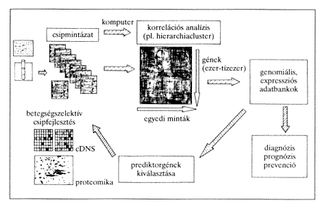 Az egyes csipekrõl bekerülõ adathalmaz bioinformatikai elemzése nyomán a számítógép clusterekbe rendezi a kapott információkat (2. ábra). Erre egy példa a hierarchiacluster korrelációs analízis. Itt egy olyan mátrix ábrázolás az elemzés eredménye, ahol az egyes oszlopok az egyedi mintákat, az egyes sorok az egyes géneket jelentik. A számítógépes összerendezés lényege az, hogy a hasonló, majd egyre kevésbé hasonló géneket kifejezõ mintákat csoportokba rendezve tüntetik fel. Az egész csip munkalogisztikája tehát úgy fest, hogy az egyes mintákból származó egyedi microarray adatok bioinformatikai összegzése után a számítógépes adatbankok meglévõ mintázatkönyvtárai segítségével következtetéseket vonunk le. A következtetések természete biomedicinális területen legalább kétféle.