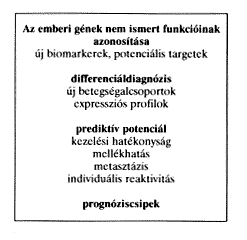 Biomedicinális értelemben ezzel az új eljárással emberi gének nem ismert funkcióinak azonosítása, új biomarkerek (diagnosztika), potenciális targetek (gyógyszerfejlesztés) kijelölése válik lehetõvé (3. ábra). A genomiális medicina differenciál-diagnosztikai lehetõségekkel, a megelõzés új alternatíváival, a kezelések, gyógyszerhatások-mellékhatások feltárásával gazdagítja az kutatói, klinikai tevékenységet.