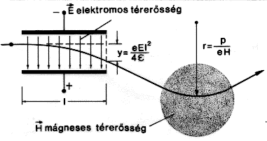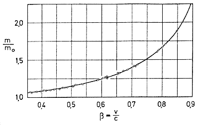 Az elektronnak természetesen van tömege. Éppen az elektron, a mozgó töltés tömegének röptében való megmérése és éppen J. J. Thomson eljárása adott keresztezett állandó elektromos és mágneses erôtereken való átfuttatása (2. ábra) vezetett részleteiben is érdekes, mert nem várt eredményre. Amit nem vártak, az az volt, hogy az e/m-mérés változó eredményhez vezet aszerint, hogy milyen sebességû (mekkora gyorsítófeszültséggel indított) elektronról van szó! (Nulla gyorsítófeszültség felé extrapolálva - mert a Thomson-eljárás álló elektronnal nem mûködik - az álló elektron fajlagos töltése e/mo=1,76 · 1011 C/kg, és a Millikan-féle töltésértékkel mo =9,1091 · 10-31 kg adódik. Viszont a gyorsítófeszültség növelésével jellegzetes, sebességtôl függô tömeg jelenik meg, ahol az m mozgási tömeg és az mo nyugalmi tömeg között az összefüggés (2. ábra):