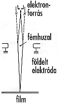 | 3. ábra. Möllenstedt és Düker elektronhullám-interferencia kísérlete, az optikai Fresnel-biprizmás eljárás mintájára (a). Földelt elektródák között futó vékony, negatív töltésû fémszálra merôlegesen indított elektronnyaláb két részre oszlik, úgy kerüli meg a szálat, majd a filmnél az elektronhullámok találkoznak. Az interferencia (b) elôáll, mert a koherens hullám optikailag, virtuálisan vált ketté. | |