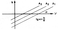 | 1. ábra. A Planck-állandó mérése fényelektromos hatással. Különbözô A1, A2, A3..., kilépési munkájú fotoaktív fémekbôl kiléptetett elektronok 1/2 · mv2 mozgási energiáját V ellenfeszültség alkalmazásával mérjük. A koordinátarendszer x tengelyére a fény n frekvenciáját, az y tengelyére az ellentér V feszültségét mérjük fel. A törvényt egyenesek ábrázolják, melyek meredeksége h/e. |